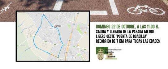 Con motivo del anuncio de construcciรณn de un nuevo tramo de carril bici, el Ayuntamiento de Boadilla del Monte ha organizado para el prรณximo domingo 22 de octubre una marcha ciclista de 7,2 kilรณmetros de recorrido, que tendrรก salida y llegada en la parada de Metro Ligero Oeste Puerta de Boadilla. La salida se producirรก a las 11:00 horas y el recorrido completo serรก el siguiente: Puerta de Boadilla, avenida Siglo XXI, avenida Infante D. Luis, Miguel รngel Cantero Oliva, Valle del Moro, Rรญo Zรบjar, Monte Romanillos, Cruce M-513, avenida Vรญctimas del Terrorismo y Puerta Boadilla.
