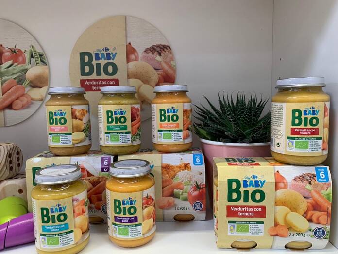 My Carrefour Baby dispone de un amplio surtido de productos con los que alimentar a los bebés y ahora, en sus nuevos tarritos además de ser ecológicos se han eliminado de su fórmula ingredientes innecesarios, como azúcares, zumos de fruta para endulzar o sal añadida. Además no llevan ningún tipo de aditivo como harinas espesantes, conservantes o colorantes. Las nuevas recetas se elaboran con ingredientes naturales y ecológicos y los que requieren algún tipo de cocinado como los tarritos de carne, pescado, o verduras y legumbres, se elaboran al vapor con aceite de oliva virgen extra. En el caso de las papillas de cereales, también son ecológicas y no llevan cereales hidrolizados ni azúcares añadidos.