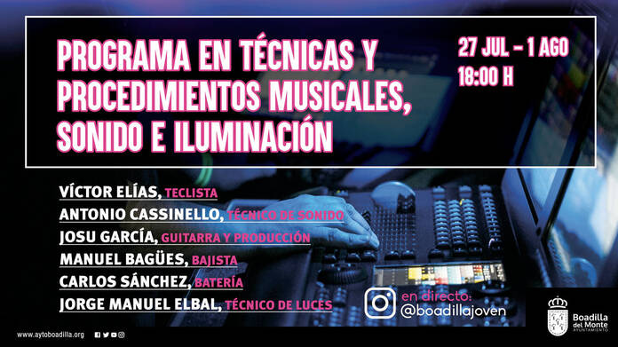 La Concejalía de Juventud va a organizar entre los días 27 de julio y 1 de agosto un ciclo de conferencias online sobre producción musical, sonido e iluminación, que podrá seguirse a través de sus redes sociales en @Boadillajoven. Todas las sesiones tendrán lugar a las 18.00 horas.