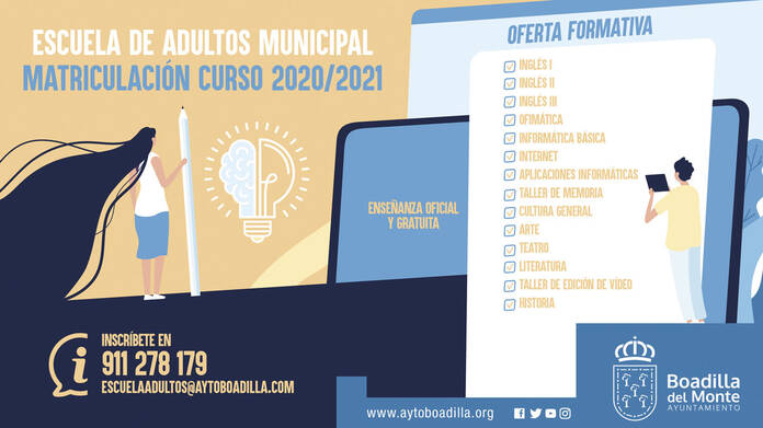 La Escuela de Adultos de Boadilla del Monte, dependiente de la Concejalía de Educación, ha abierto el plazo de inscripción de sus Enseñanzas Abiertas dirigidas a las personas que quieran ampliar sus conocimientos en una variedad de materias de carácter cultural y educativo. La enseñanza es oficial y gratuita.
