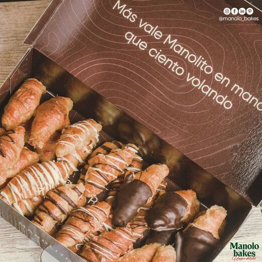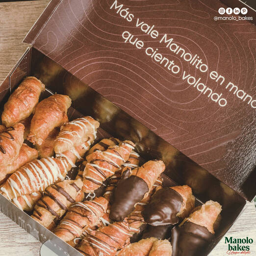 Si te dicen ‘voy a comprar unos Manolitos para merendar’ todos sabemos de lo que nos están hablando. No necesitan presentación. Así se llaman los pequeños croissants de hojaldre y mantequilla que tienen en esta pastelería. Los encontrarás cubiertos de chocolate blanco, negro, mixtos o clásicos sin chocolate.