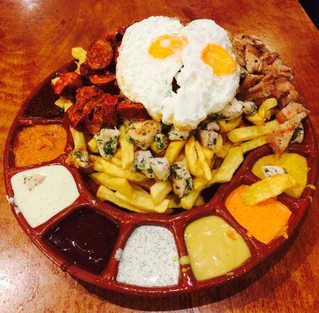 Es famoso desde hace más de 30 años por sus tablas de patatas con 14 salsas diferentes, totalmente caseras, y sus carnes a la parrilla cocinadas en roca volcánica. Además, el tamaño de la tabla lo eliges tú.