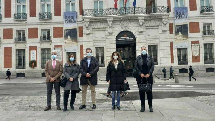 El alcalde de Parla, Ramรณn Jurado, y parte de su equipo de Gobierno se han presentado en la Puerta del Sol para exigir a la presidenta regional, Isabel Dรญaz Ayuso, que les explique por quรฉ se mantienen con restricciones las zonas bรกsicas de salud (ZBS) de San Blas y Pintores cuando tienen una incidencia de menos de 500 casos por cada 100.000 habitantes, concretamente rondan los 350.