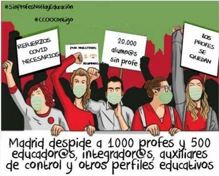 Según la secretaria general de la Federación de Enseñanza de CCOO de Madrid, Isabel Galvín, “quieren prescindir de 1.000 docentes y casi 500 profesionales como técnicos especialistas, educadores, auxiliares de control y administrativos, que también han sido contratados hasta el 22 de diciembre para aplicar las medidas de refuerzo Covid en los centros”.