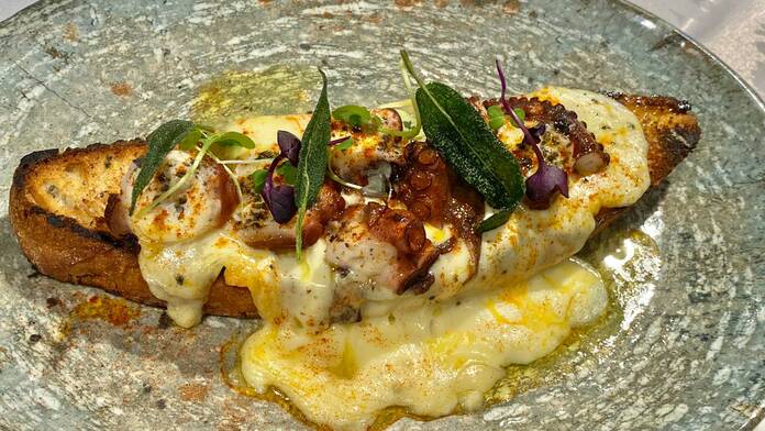 El menú completo está compuesto de empanadillas de pulpo con tinta y wakame, pulpo a la brasa ahumado con alioli negro y mojicón, souffle de crema catalana con Mascarpone y piña guisada al ron. Cuesta 46€.