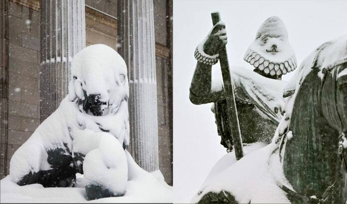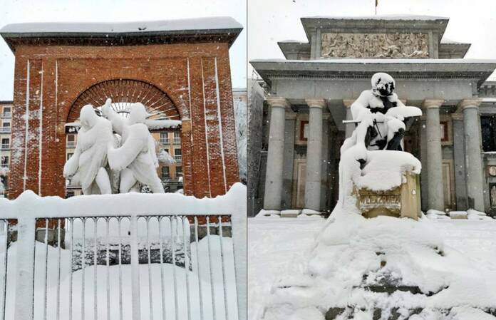 Los protagonistas de la historia de Madrid no faltaron a esta gran cita. Las estatuas de la capital, fieles testigos de todo lo que pasa a sus pies, amanecieron totalmente cubiertas de nieve gracias a la fuerza de Filomena.