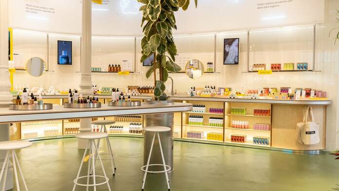 La joven firma de cosméticos naturales presenta un espacio de diseño industrial, muy limpio y depurado. Está dividido en diferentes áreas: una zona de diagnóstico; otra dedicada al maquillaje; una gran zona de ‘tester bar’; y el área ‘zero waste’ o cero residuos.