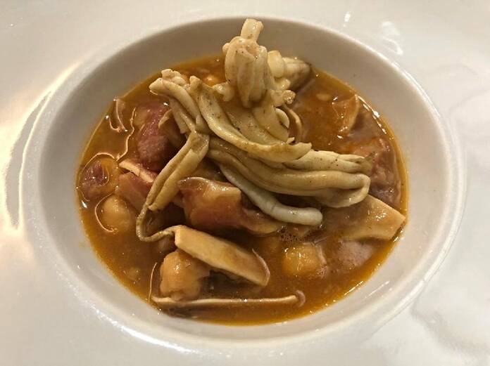Juanjo López es un apasionado de la oreja, por eso siempre la incluye en su carta. Lleva años evolucionando una tarrina de oreja, y decimos ‘evolucionando’ porque va variando su receta: a veces con salsa, sin salsa, crujiente, la mete con espardeñas o con lo que se le ocurra. Es una maravilla.