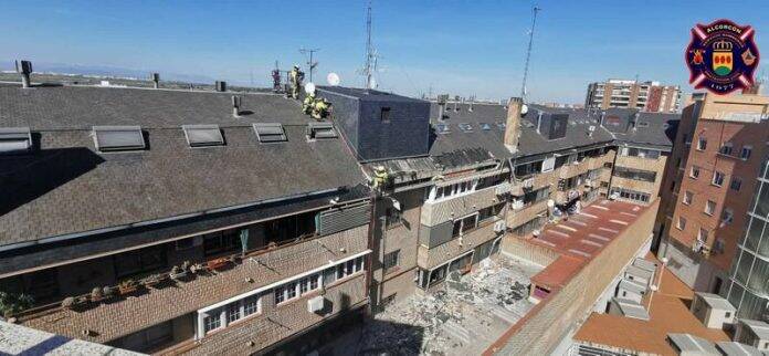 Los efectivos de Bomberos han intervenido ante el derrumbe de parte del tejado de un edificio situado en la calle Tordesillas del municipio de Alcorcón, en el que no ha habido que lamentar heridos, solo daños materiales.