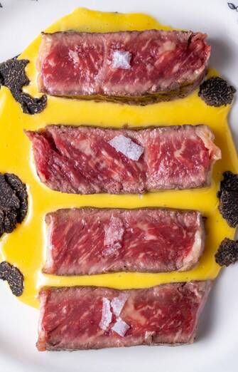 - Plato: Sol de invierno. Es un fondo de huevo, con trufa de invierno de Teruel y bajo cama de tataki de vaca rubia gallega y flor de sal de Ibiza.