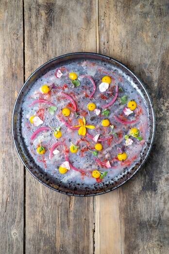- Plato: Carpaccio di gambero rosso.
