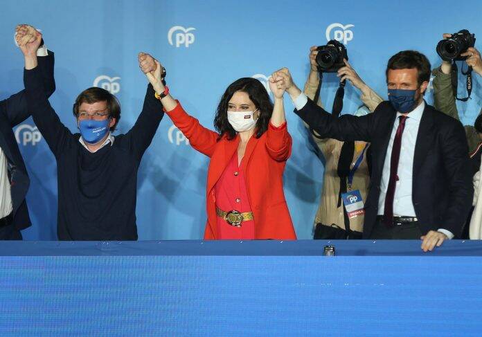 Dirigentes del partido bailan y celebran ya la victoria de la presidenta madrileña en la calle mientras que Ayuso y el presidente del PP, Pablo Casado, continúan dentro siguiendo el escrutinio.