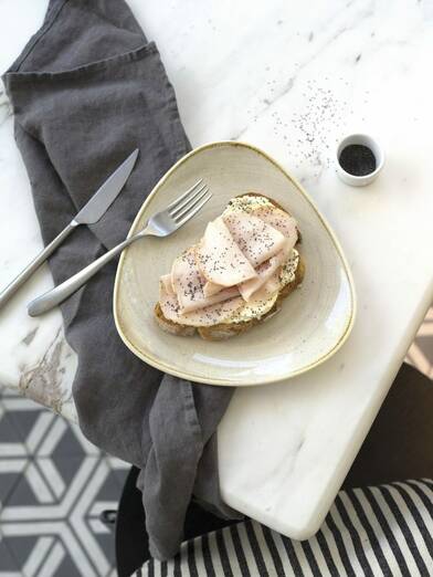 Pero hoy venimos a hablarte de su sándwich mixto. En el plato encontrarás pavo braseado, jamón york, queso feta y cebollino con una selección de pan Crustó para que lo montes a tu gusto. Si, si, has leído bien. Porque esta delicia ligera incluida dentro de su brunch… ¡la confeccionas tú mismo!