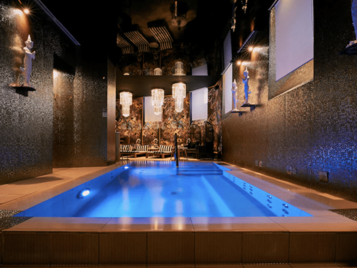 Una piscina cubierta iluminada con colores tenues.