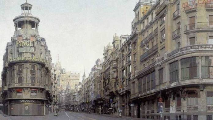 El pintor inmortalizó a la Gran Vía desde la calle Alcalá, como si el tiempo se pudiera parar y guardarlo para siempre sobre un lienzo.