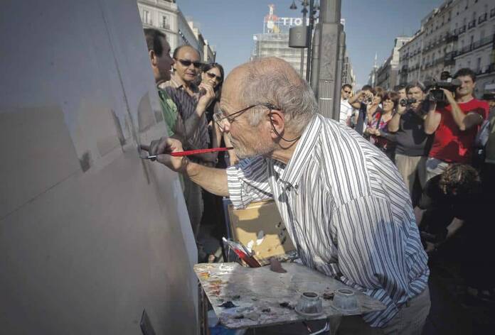 La luz del verano es la musa que inspira al pintor. Por ello, cada tarde acude a la Puerta del Sol con su mítica gorra roja. Allí ha pintado sus huellas en el suelo, para posar sus pies en el mismo sitio y no perder así la perspectiva del gran epicentro de la capital.