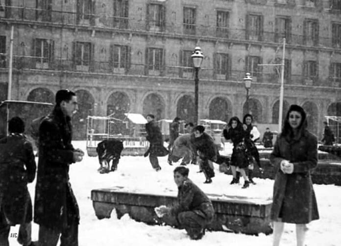 Madrileños jugando en la Plaza Mayor con la nieve en la gran nevada de 1945