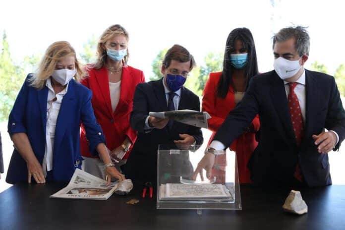 El alcalde de Madrid, Josรฉ Luis Martรญnez-Almeida, acompaรฑado de la vicealcaldesa, Begoรฑa Villacรญs, de los delegados de Obras y Equipamientos, Paloma Garcรญa Romero, y de Desarrollo Urbano, Mariano Fuentes, del concejal delegado de Vivienda, รlvaro Gonzรกlez, y de la concejala de Villa de Vallecas, Concha Chapa, ha colocado este martes la primera piedra de las obras de urbanizaciรณn de Valdecarros, que dotarรก a Madrid de 51.600 viviendas.