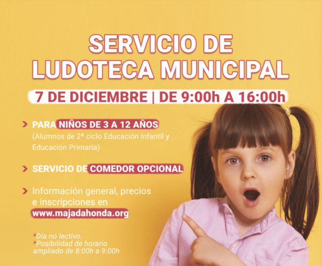El Ayuntamiento de Majadahonda ha organizado una ludoteda Municipal para los ‘días sin cole’ del mes de diciembre. La misma contará con una programación de actividades dirigida a escolares de entre 3 y 12 años (2º ciclo de Educación Infantil y Educación Primaria). Para poder participar los niños tendrán que estén empadronados en la localidad o sus padres trabajar en la misma.