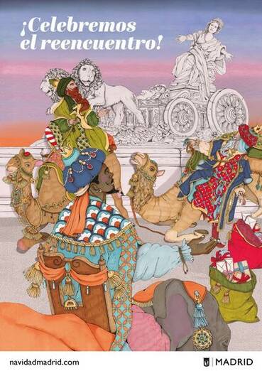 Los tres Reyes Magos, Melchor, Gaspar y Baltasar, se reencuentran con la diosa Cibeles a su llegada a Madrid en el cartel navideรฑo del ayuntamiento de la capital, obra de Ana Jarรฉn, que se ha inspirado en la iconografรญa tradicional de los belenes napolitanos.