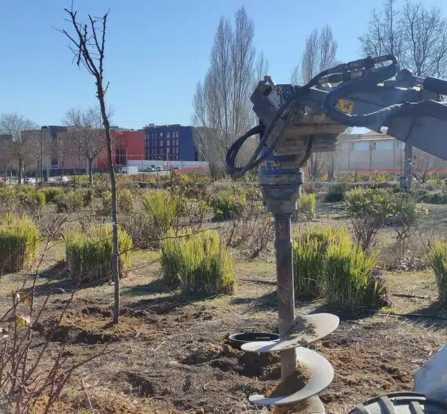 Otras ochenta unidades más (20 cipreses, otros tantos cinamomos, 20 ciruelos de hojas púrpura y 20 ‘Cercis siliquastrum’, más conocido como “árbol del amor”) están siendo plantadas esta semana en el parque semicircular situado entre la Avenida de las Planetas y la Avenida de las Estrellas, detrás del colegio Madre Teresa de Calcuta.
