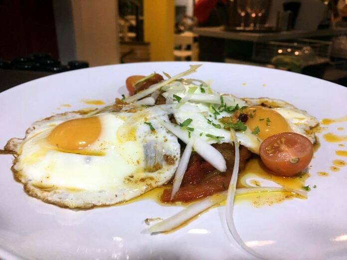 Huevos al ajoarriero con ensalada de pimientos rojos asado, pan bao preñadito y una yema, mini hamburguesa con huevo o el pisto con huevo frito a la albahaca.