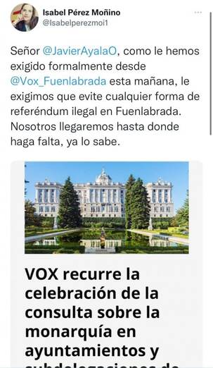 Es por ello, que desde Vox Fuenlabrada han pedido al alcalde socialista y al PSOE Fuenlabrada que no autorice el referéndum ilegal sobre monarquía o república. Por su parte, Isabel Pérez Moñino, ha expresado en su cuenta oficial de Twitter el descontento con el ayuntamiento municipal sobre el asunto de la votación que se llevará a cabo el próximo sábado . Tanto es así, que la representante del partido afirma que serán capaces de llegar hasta donde haga falta para recurrir la celebración.