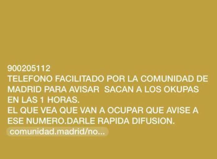 Información que parece “prometer” a los receptores que la Comunidad de Madrid podrá actuar contra los okupas… en tiempo récord. “Teléfono facilitado por la Comunidad de Madrid para avisar. Sacan a los okupas en una hora. Dadle rápida difusión” apremian desde las redes sociales.