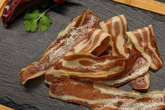 El beicon 100 % vegetal es la primera referencia que se producirá y está previsto que su venta llegue al mercado nacional antes del verano de la mano de Foodys Cocuus. Se hará en bandejas refrigeradas de 120 gr. a un precio muy “competitivo”. Un producto superior, con mucha menos grasa, sin gluten ni soja y con todo el sabor y textura de su análogo. Y, tras este lanzamiento, preparan la producción de gambas, salmón, pulpo, foie o atún plant-based, entre otros.