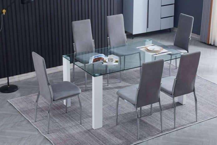 Este conjunto de muebles lo componen 6 sillas más una mesa de cristal. Por el lado de las sillas, estas son tapizadas con tela gris y tienen unas dimensiones de 98 cm de alto, 41 cm de ancho y 52 de fondo. Con respecto a la mesa de cristal, esta es fija y tiene unas dimensiones de 140 cm de largo, 80 de ancho y 75 de alto.