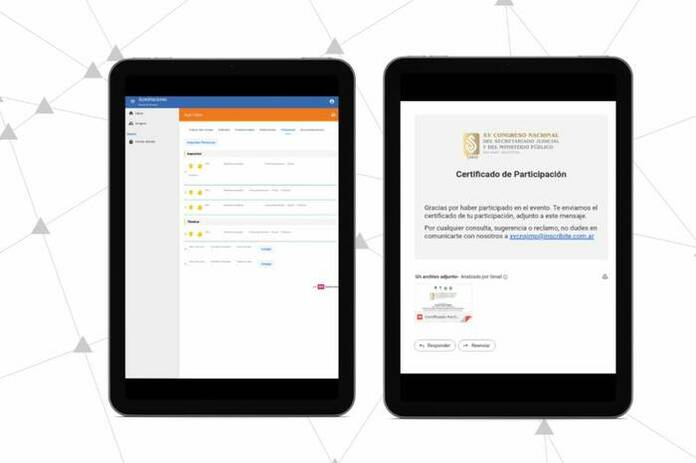 Finalmente, también aborda la logística de las acreditaciones. Esto implica la creación y distribución de credenciales, pulseras, tarjetas PVC y entradas personalizadas. Estos elementos son esenciales para garantizar un control adecuado de acceso y una experiencia organizada para los participantes. Para el cierre del evento, se genera automáticamente un certificado de participación según el tipo de participante, el cual es enviado vía email a cada uno de los que fueron acreditados.