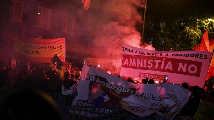 Según la Delegación del Gobierno, más de 7.000 personas se congregaron frente a la sede del PSOE en la calle Ferraz de Madrid y sus alrededores para protestar contra la amnistía y los pactos del partido con el independentismo