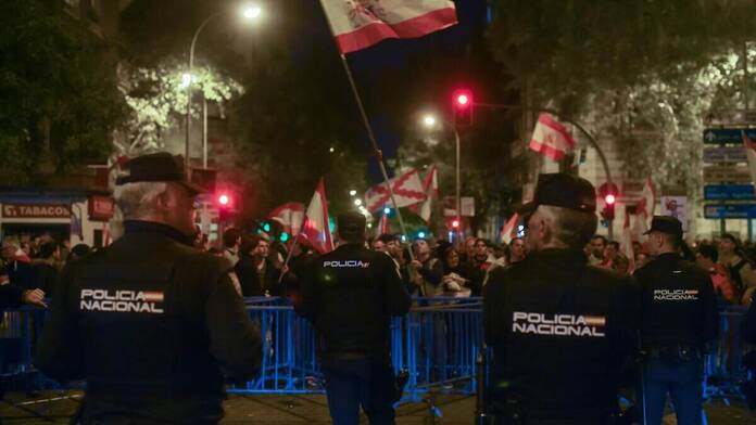 Los manifestantes, frenados por un cordรณn policial en la esquina de Ferraz con Marquรฉs de Urquijo, han protestado una noche mรกs portando banderas de Espaรฑa, ademรกs de varias franquistas y una en la que se podรญa leer โLa Constituciรณn destruye la naciรณnโ, mientras otros han defendido la Carta Magna.