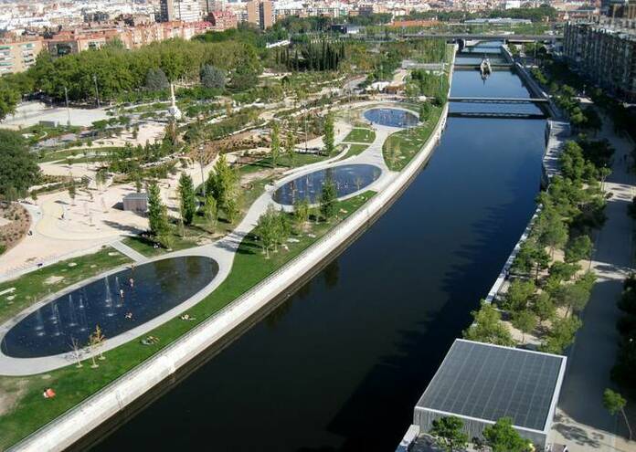 La arquitectura paisajista de Madrid Río gira en torno al agua. La renovación del Manzanares ha permitido la creación de playas urbanas y zonas estancas que, en los días calurosos, proporcionan un lugar idóneo para el esparcimiento.