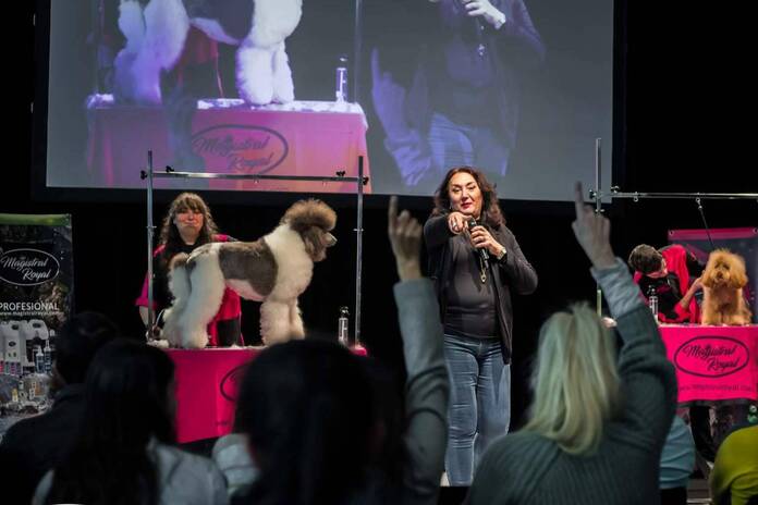 Acto seguido se sucedieron diversas demostraciones de peluquería canina en distintas razas, todas ellas acompañadas de las explicaciones de cada ponente peluquero. Como “speaker” en todo momento estuvo M. Eugenia Ribelles, quien durante muchos años ha sido profesional de la peluquería canina y cuenta con un amplio reconocimiento internacional. M. Eugenia Ribelles ha realizado demostraciones de peluquería canina y ha establecido relaciones comerciales en países como Arabia Saudí, Ecuador, Corea el Sur, China, Japón, Tailandia, Brasil, Argentina, Chile, Perú, Colombia, Venezuela, Italia, Bélgica Francia, Suiza, Noruega, Austria, Bulgaria, Lituania, Letonia y Estonia, a los que previsiblemente se sumarán otros.